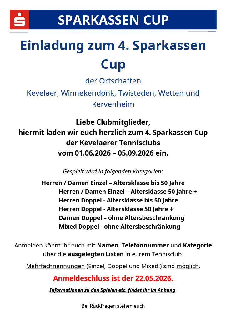 es ist wieder so weit! Wir laden euch herzlich zur vierten Runde des Sparkassen Cups der Kevelaerer Tennisclubs ein. Vom 01. Juni bis zum 05. September 2026 messen wir uns wieder mit den Spielern aus Winnekendonk, Twisteden, Wetten und Kervenheim.